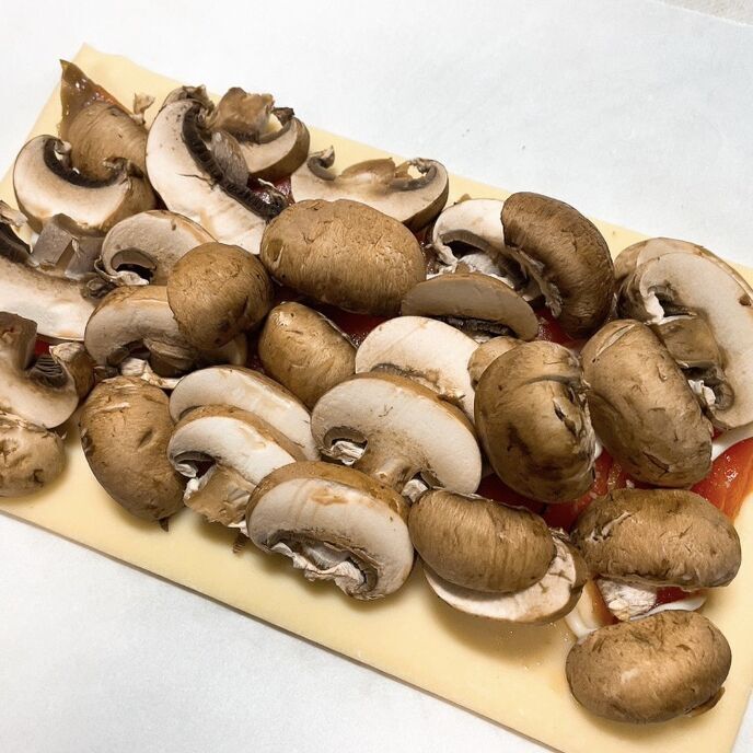 その上に、数ミリにスライスしたブラウンマッシュルームを満遍なくたっぷりと。