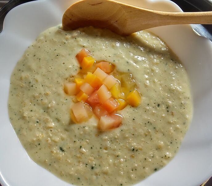 アーモンドミルクとオートミールを煮込み、抹茶と塩で味付けしました。フルーツ蒟蒻をトッピング。