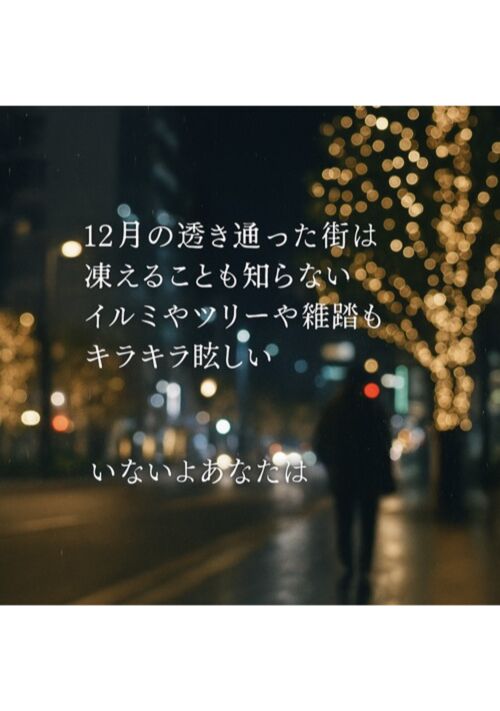これは小説ではなく、歌詞です。 この暑い時期に12月かよ!って感じなんですけど…… 前から保存していたものが、自分の不注意でほとんど消えてしまい、そのときの喪失感と言ったらヤバすぎて、どうせならここに書いて残そうと思い投稿しました。 ぜひ、読んでください。