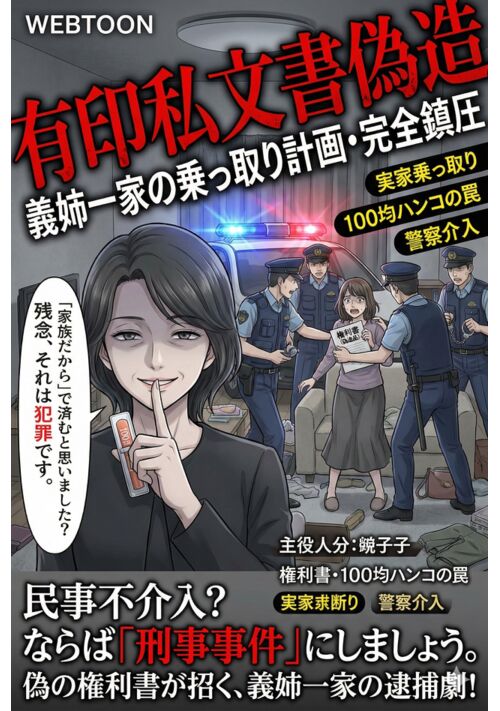 覚醒した母と娘は結託し、ある「罠」を仕掛ける。それは、パソコンで作った『ニセの権利書』と『100均の三文判』。 欲に目がくらんだ義姉一家がそれに手を伸ばした瞬間――民事トラブルは、言い逃れできない「刑事事件」へと変わる。