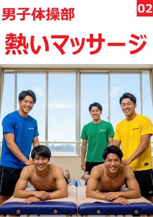 使い捨てシーツの寝台が並ぶブースに、柑橘系のローションの香りが漂い、陽光がカーテンの隙間から差し込む。3年生の真邊佑司は、汗ばんだTシャツ姿で2年生の高瀬恒征や坂口太河たちとの軽口に笑う。店内は客の男子学生たちで賑わうが、佑司のブースには客が来ない。そんな時、インカレを終えて引退した4年生、韮川悠人と松谷貴晃が入店。懐かしい空気に部員たちの目が輝く。韮川は佑司のブースへ、松谷は高瀬のブースへ。カーテンを閉め、BGMのピアノが流れる中、リラクゼーションが始まる。佑司の指が韮川の肩に沈むと、硬い筋肉の溝から汗の塩辛い匂いが立ち上り、インカレの夜――旅館での罰ゲームがエスカレートした熱い記憶がフラッシュバックする。韮川の息が乱れ、「もっと深く押せよ」と囁く。隣のブースから松谷の「んっ、そこいいよ」という声が漏れ、坂口のサポートが入る中、空気が熱を帯びる。ローションのぬるぬるとした感触が肌を滑り、肩から背中、腰へ。短パンの裾を掠め、内ももの膨らみに触れると、韮川の体がビクッと反応。坂口の提案で「スペシャル前立腺ケア」が始まり、全裸の韮川の太い陰茎が露わになる。佑司の指がアナルに沈み、前立腺を押す感触に、韮川の16cmの陰茎が脈打つ。「佑司、そこだ……ヤバいぞ」と喘ぎ、坂口の唇がそれを包む。隣のブースでも部内一の巨根の持ち主・高瀬の手技が松谷を刺激し、喘ぎが重なる。順番待ちの客の声が廊下から聞こえる中、グチュグチュの水音がスリルを煽る。エスカレートは止まらず、全員が全裸に。佑司の色白の体が陽光に晒され、12cmの陰茎が硬くなる中、韮川の舌が佑司の乳首を這い、熱いキスが交わされる。15cmの上反り陰茎の持ち主・坂口は、韮川の太マラを扱き、佑司をサポートする。高瀬のブースから「恒征、ふざけんな……んっ、そこ!」という声が聞こえ、佑司の心は好奇心と羞恥でざわつく。「男の体なのに……なんでこんなに疼くんだよ」。反対隣りのブースから客の笑いが漏れる中、フェラチオの水音、アナルファックの快感で漏れる喘ぎ声がBGMに混ざって部屋に響く。ノンケの佑司は、松谷の16cmの陰茎をフェラし、指で前立腺を刺激されながら、バージンアナルを3本の指でほぐされる。「先輩の指の動きでビクビク……恥ずかしいのに、チンポから汁が」。ブースの薄いカーテンを隔てた日常の喧騒が、秘密の熱気を煽り立てる。インカレの夜から続く、学園祭の熱いマッサージ――それは、汗とローションの渦の中で、ノンケの限界を試す禁断の誘惑として、佑司の胸をざわつかせていた。