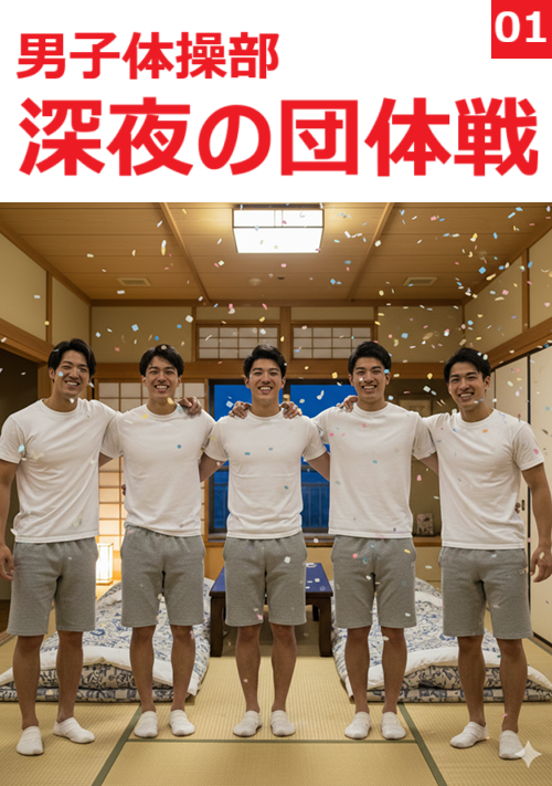 夏の夜、インカレを終えた男子体操部の5人が、旅館の一室で繰り広げる熱い「団体戦」。試合後の解放感とビールの酔いが、仲間内のトランプゲームを過激な罰ゲームへと変貌させる。畳の上で汗とアルコールの匂いが混じり、蛍光灯の薄暗い光の下、男たちの欲望が暴走する。