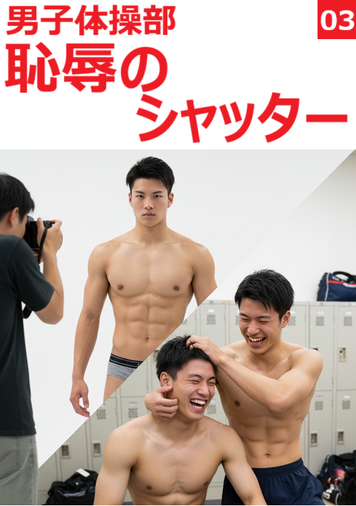 湯上がりで火照るロッカールーム。3年生のノンケ体操部員・片岡浩平が、腰タオルの下で揺れる露茎チンポを晒し、後輩の高瀬にバイトの秘密を漏らす。「下着モデルでパイパンにされ、カメラの前で勃起晒しちゃった…」。無垢な好奇心が、禁断の再現プレイに火をつける。他の部員も加わり、ノンケの理性が溶け、男たちの視線が肌を焦がす瞬間――恥辱のシャッターが、快楽の扉を開く。