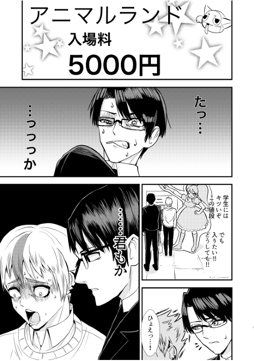 アニメのコラボメニュー目当てで遊園地に来たもののお金が足りない!そんな時割引目当てで同じ学校の人とカップルのふりをすることになり…?ギャグ・コメディ寄りのBL。