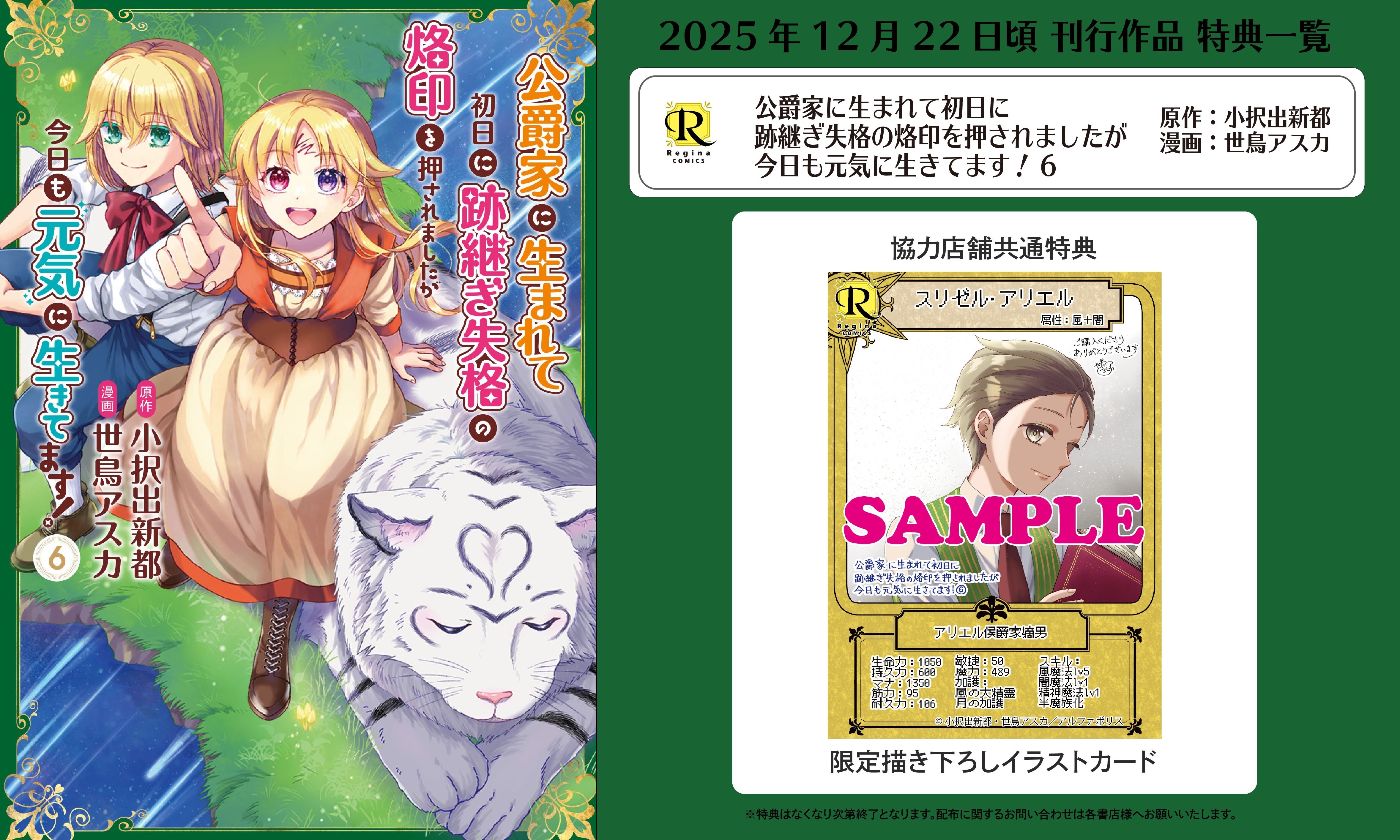 レジーナコミックス「公爵家に生まれて初日に跡継ぎ失格の烙印を押されましたが今日も元気に生きてます!6」