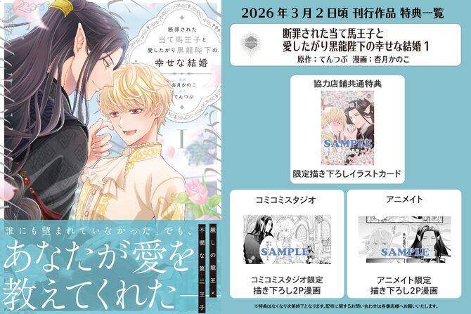 聖女を虐げたという無実の罪で、兄である第一王子に断罪されたイル。ニヴァーナ国の第二王子でありながら、妾腹ゆえに「ナイナイ王子」と蔑まれてきた彼に、ある日突然、龍人国の王・タイランから政略結婚の申し出が届く。野蛮と恐れられる龍人、しかも男同士の結婚――戸惑いと不安の中でイルは結婚式当日を迎える。けれど出会ったタイランは、誰よりも優しく、イルに甘く愛を囁いてきて――? これは、ひとりぼっちだった王子が真実の愛を知るまでの物語。 ◆ コミックシーモアにて12月1日より電子先行配信予定(紙書籍・その他電子書店:2026年3月上旬発売予定 )◆