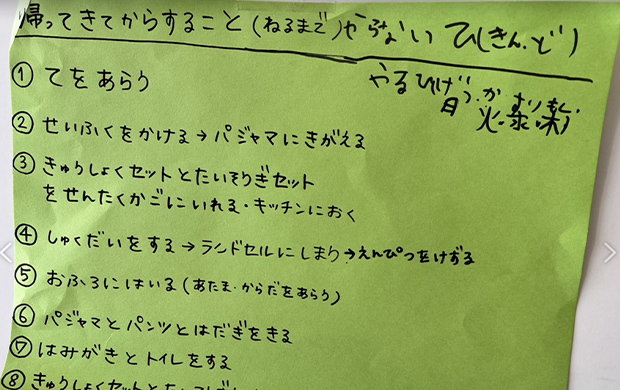 これを決めておくと、「④番できた」とか「⑦番は何時までにやるの?」といった会話が生まれ、やるべきことがわかっているので、「いつやるか」を自分で決められるようになります。