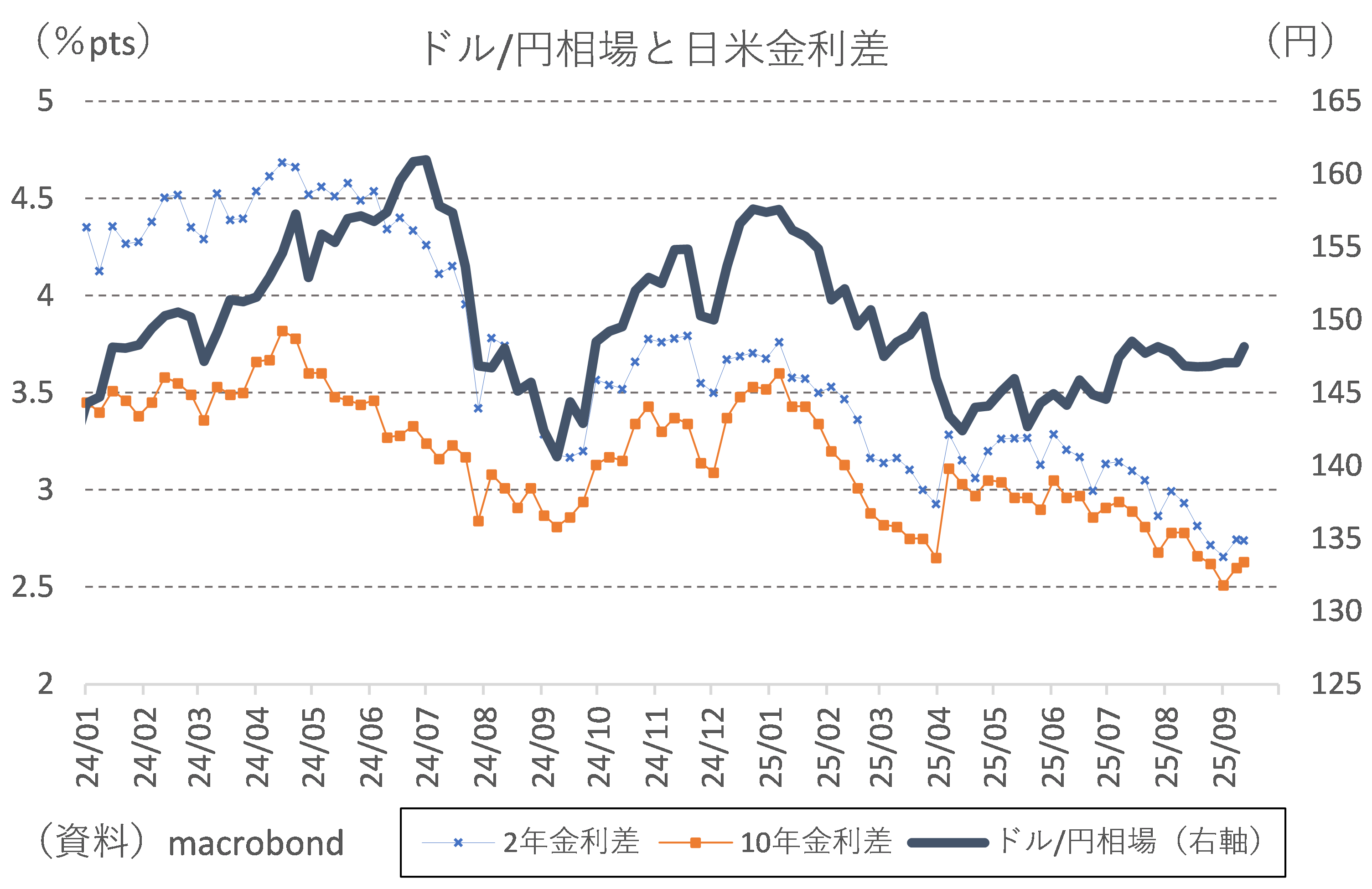 為替市場でも米国の利下げが大幅に織り込まれ、日米金利差が明確に縮小しているにもかかわらず、ドル/円相場は147~148円で高止まりしている。次期首相へのコンセンサスは定まっていないものの、「拡張財政路線に伴うインフレ継続、それと整合的な円安・株高」への期待は明らかに根強い。1年前の総裁選で石破首相と接戦を演じた高市早苗議員を念頭にトレードが進むことは必然の帰結であろう。