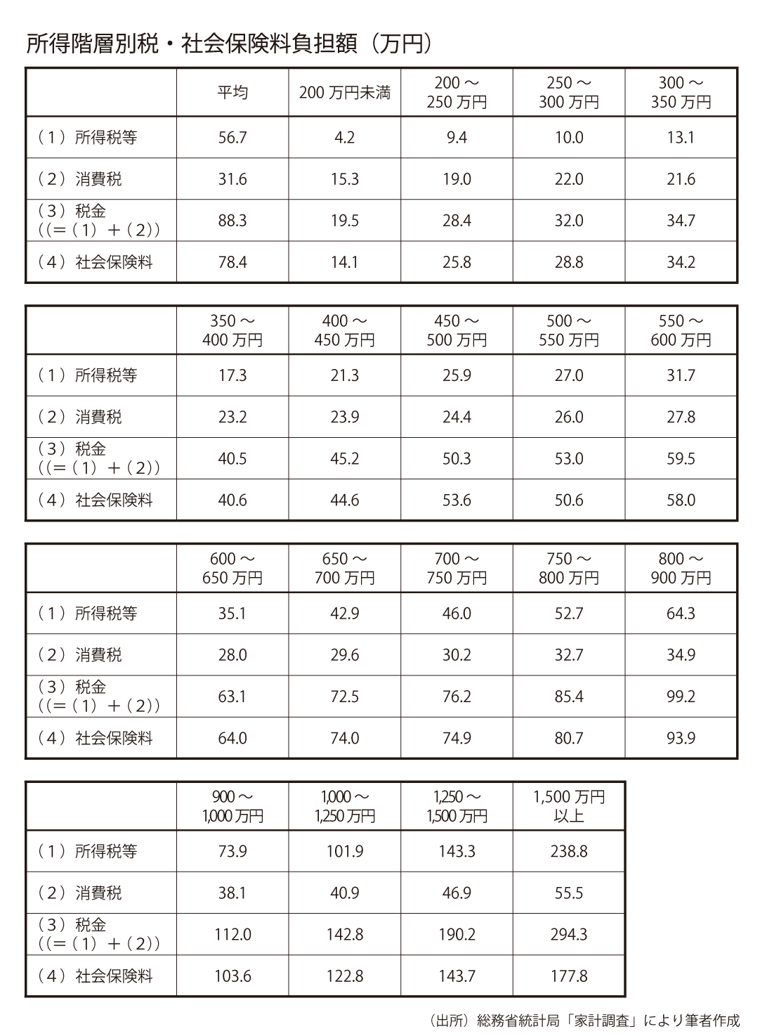 先の表3‐2によれば、所得階層別で見れば、200万円未満と1500万円以上の所得階層を除いた所得階層で、社会保険料負担が所得税等負担も消費税負担も上回っていることが分かるし、表3‐3によれば、64歳以下の現役世帯のうち、54歳以下の世帯で社会保険料負担が所得税等負担も消費税負担も上回っていることが分かる。
