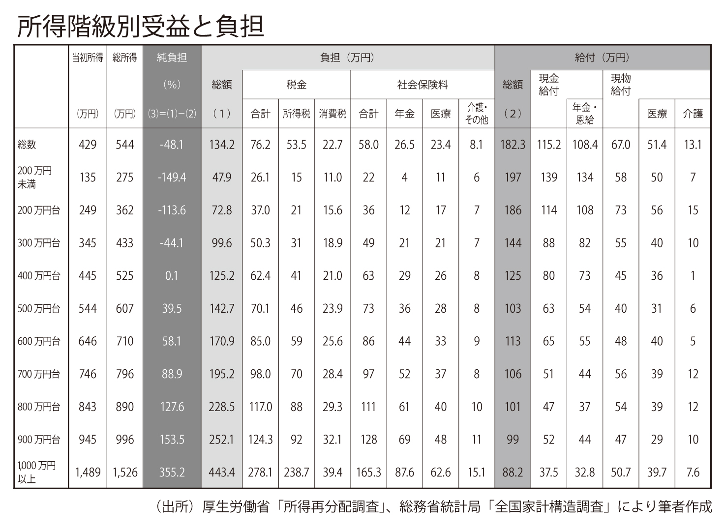 上記の表によれば、日本の場合、年収300万円台までは所得税や消費税、社会保険負担よりも給付の方が多く、400万円台ではほぼトントンとなっている。つまり、確かに消費税だけを取り出してみれば、所得の低い者ほど所得に占める消費税負担が重く、所得が上がるにつれて所得に占める消費税負担が軽くなる「逆進性」は存在するものの、所得税や社会保険負担、さらには社会保障給付を含めたトータルで見れば消費税の逆進性は解消されている。