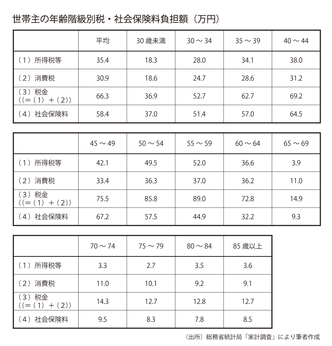 次に、同じく、総務省統計局「家計調査」を用いて、今度は、世帯主の年齢別の所得税や消費税、社会保険料の負担額を見てみよう。