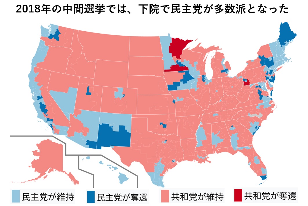 そして翌年18年中間選挙では、上院は共和党がかろうじて多数を維持したものの、下院では民主党が逆転して40議席増となり、多数を制した。各州知事選でも民主党知事が新たに7人誕生したほか、州議会でも民主党支配下の州議会を4州増やす結果となり、民主党のシンボル・カラーである“ブルー・ウェーブ”(青い波)の選挙とも呼ばれた。