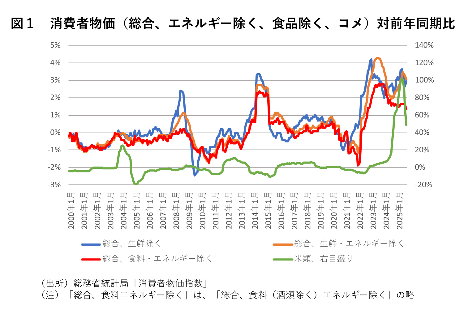 図1は、生鮮食品を除く消費者物価、生鮮・エネルギーを除く消費者物価、食料・エネルギーを除く消費者物価、米類(右目盛りになっている)の対前年同月比を示している。
