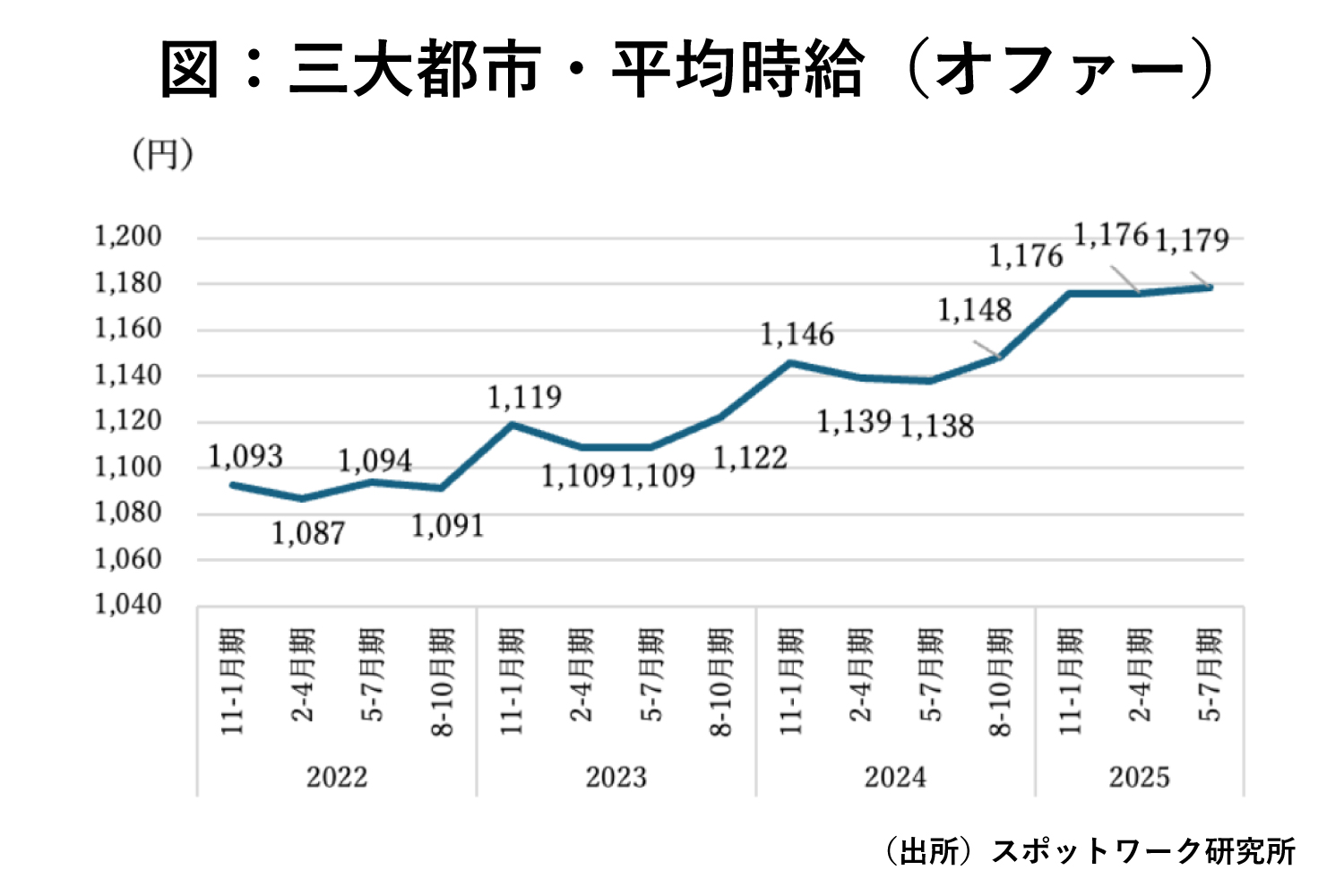 もう一つの課題は、スポットワークの平均時給が決して高くないことである。スポットワーク研究所「スポットワーク市場 クォータリーレポート」によれば、25年5月~7月期の三大都市圏のスポットワーク平均時給は1179円となっている。これではフルタイム並みに働いても1カ月で19万弱にしかならない。