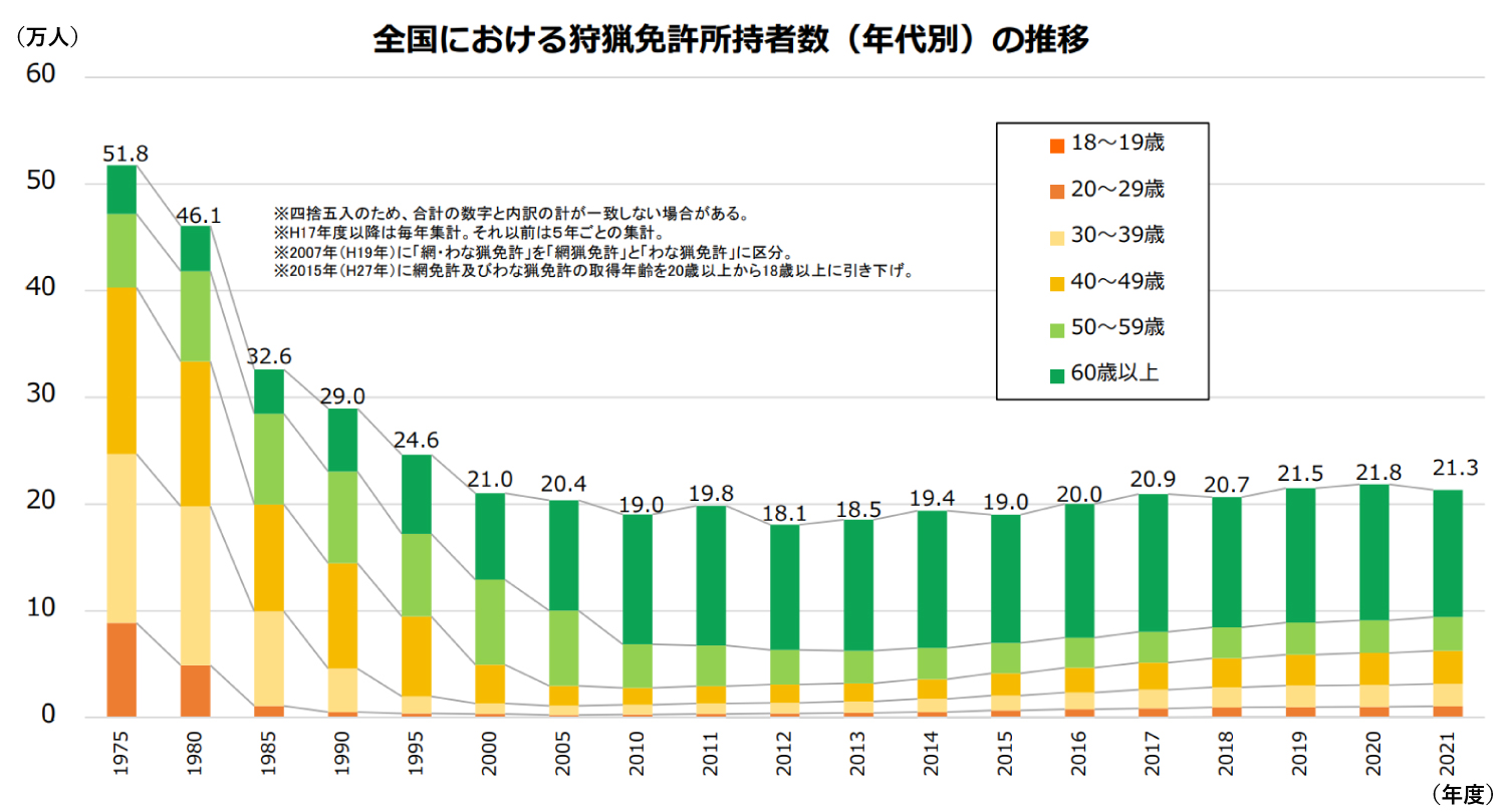 だが推移をよく見ると、ここ10年ほどは反転している。12年度は約18万700人だったが、21年度は約21万3400人と増えた。ただし、免許は猟銃のほかワナ、網、空気銃も含む4種類の合計だ。重複取得もあるから実勢はもっと少ない。