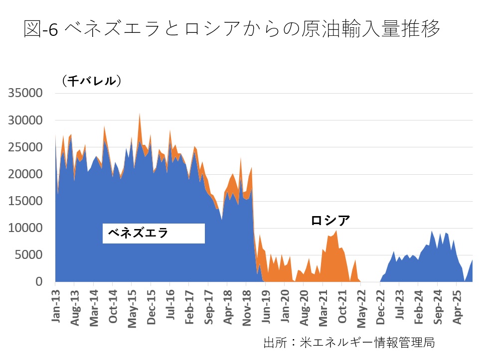 22年のロシアへの制裁によりロシア産原油が禁輸になった際には、ベネズエラで生産していたシェブロンに許可を出しベネズエラ産原油の輸入を再開することで穴埋めした。図-6がこの状況を物語っている。