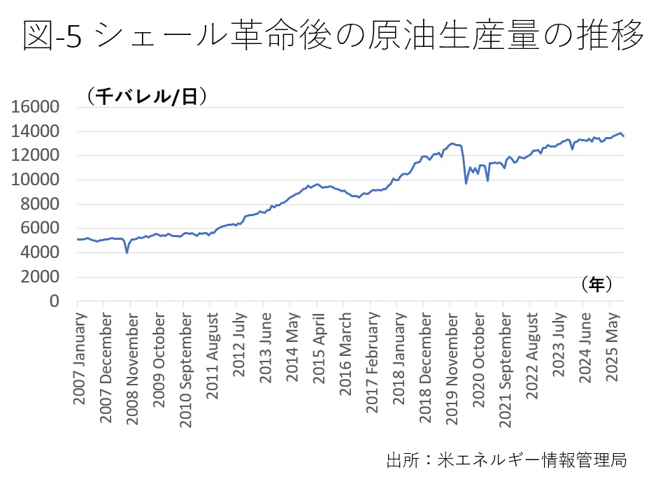 2000年代後半のシェール革命により、米国はシェール層からの天然ガス、石油の商業生産に成功し、原油生産は2.5倍になった(図-5)。天然ガス、石油共に自給率が100%を超えた。しかし、米国は依然原油の輸入を続けている。