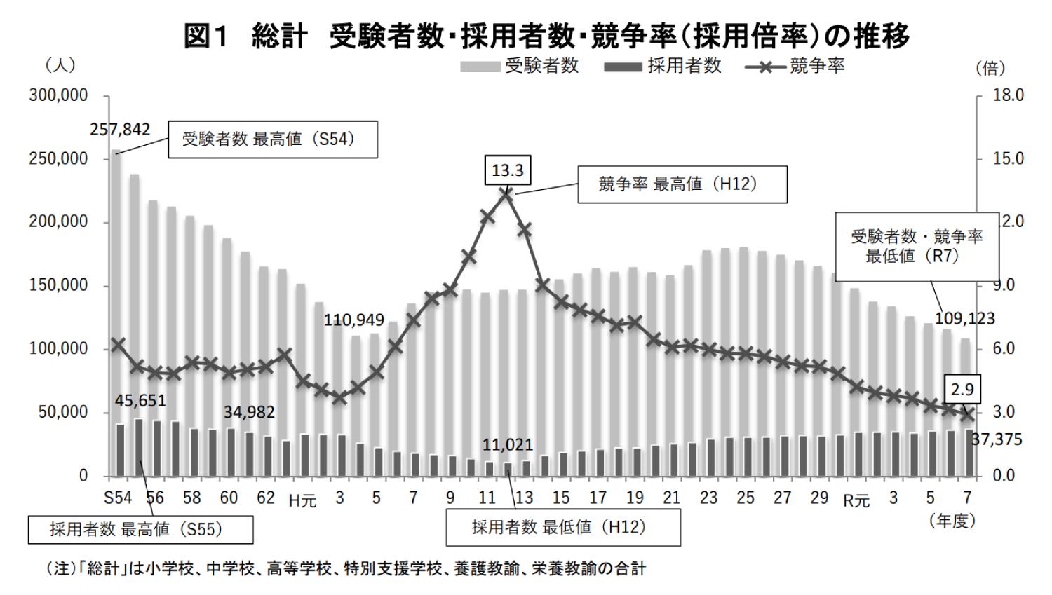 倍率がそれを下回れば、教育の質が揺らぐ――少なくとも採用現場では、そう受け止められてきた。教員の資質低下が指摘されて久しい中で、「2.9倍」という数字は、そうした危機感を客観的に可視化したものと言える。