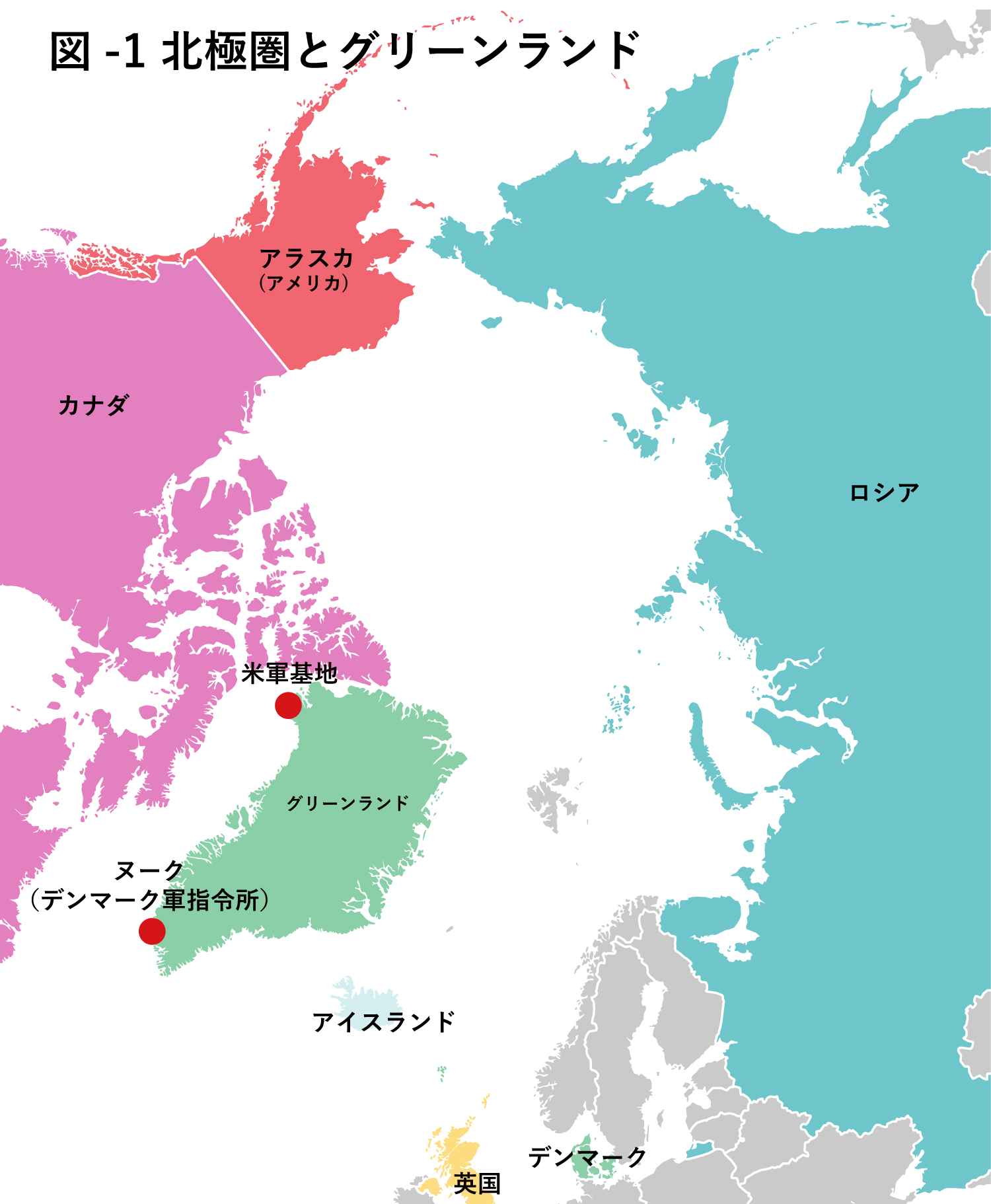 北極を中心にした地図(図-1)を見ると、グリーンランドの安全保障上の重要性が分かる。グリーンランド(G)、アイスランド(I)、英国(UK)を結ぶ線は、GIUKラインと呼ばれる米国の北大西洋の防衛ラインだ。