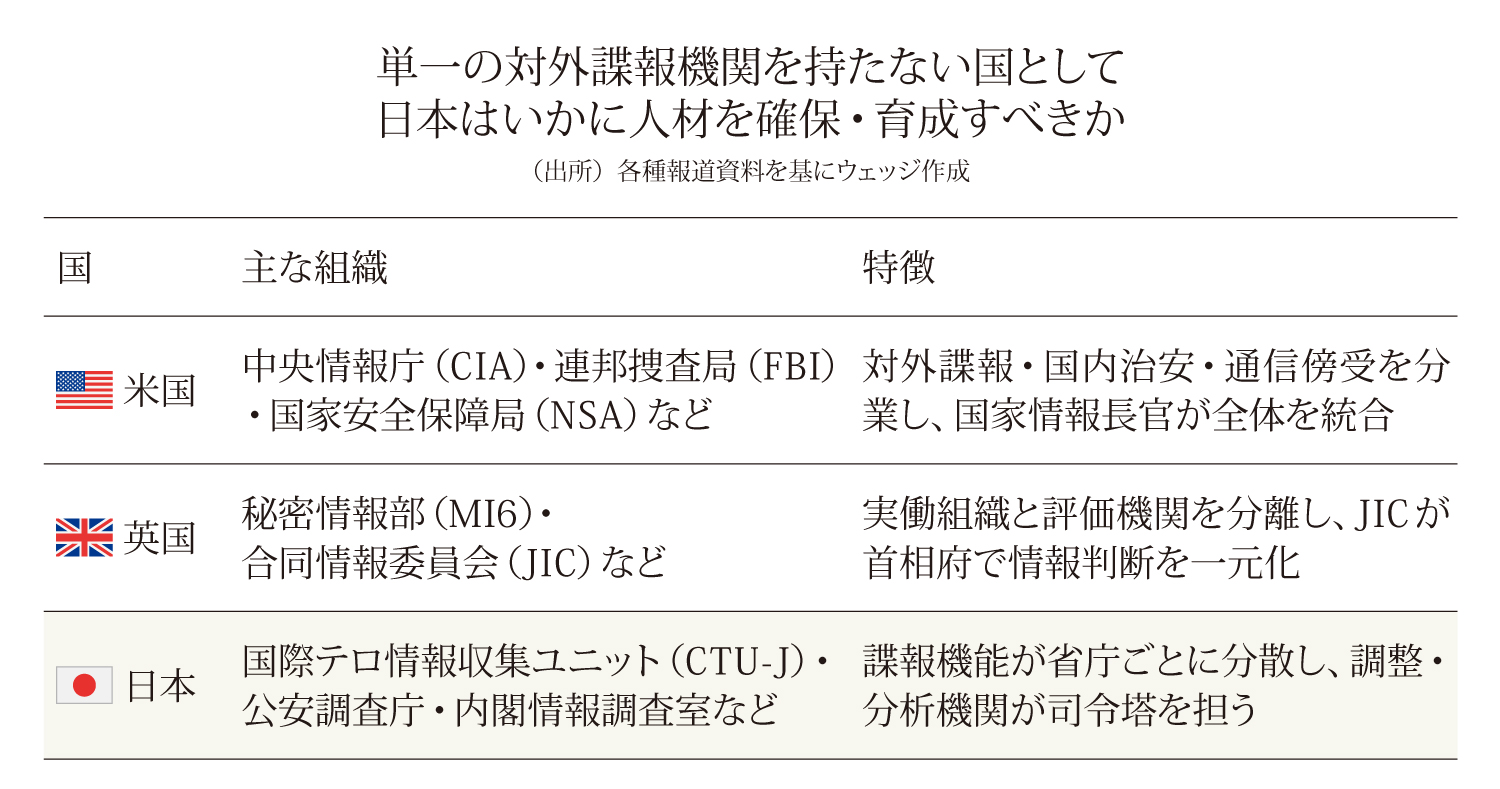 対外インテリジェンス組織は、海外にアセットを持つ外務省の協力が不可欠だ。CTU−Jも組織上は外務省に設置されているが、他方、情報機関は情報と政策の分離の原則から、政策官庁の中に置くことは好ましくなく、また政治指導者に直接情報を伝えられることが重要なので、同組織は内閣官房の指揮下にも置かれている。そのため日本が対外インテリジェンス組織を持つのであれば、CTU−Jの拡充が最も現実的な方法であるが、どのような組織としていくかは、さらに議論を詰めていく必要があるだろう。