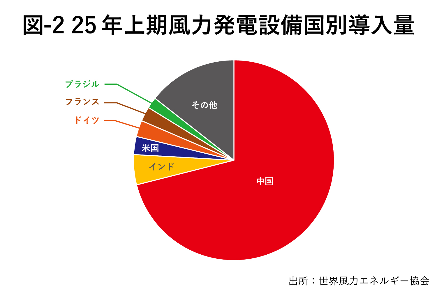 25年1月から6月に世界で導入された設備量は約7200万kW。24年1月から6月の世界の導入量4400万kWから大きく伸びたが、その伸びの大半は中国での設備導入だ。中国の導入量は、2580万kWから5140万kWに倍増した。2位インドの導入量350万kWの10倍以上だ。