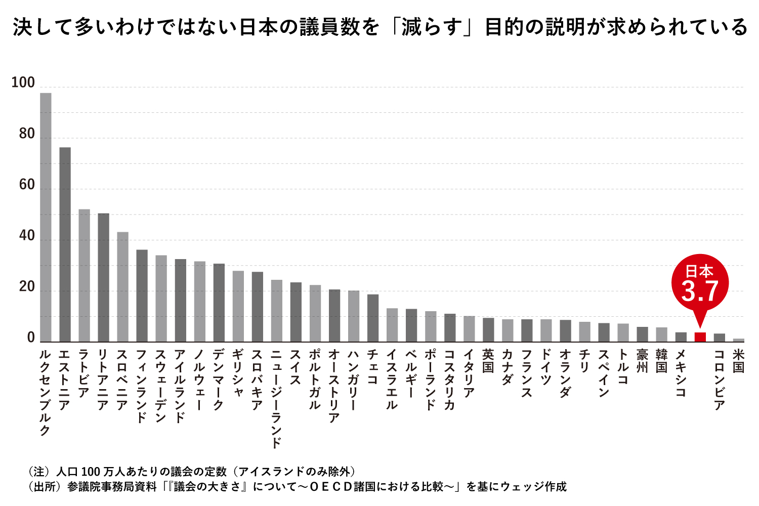 ただし歴史上の議院制度導入にあたっても、参照されたのは国際比較である。国際議員連盟(IPU)のデータによれば、現在の人口あたりの議員数を国際的に比較すると、日本は経済協力開発機構(OECD)38カ国中36番目に議員数が少ない。