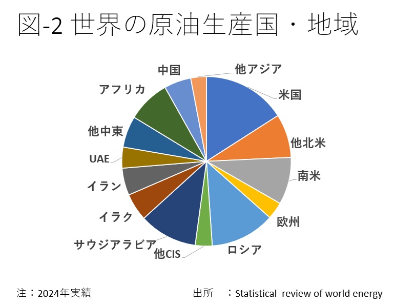 1973年に石油輸出国機構(OPEC)は世界の石油生産の51%のシェアを持ち、中東諸国は、サウジアラビアの13%を筆頭に37%のシェアを持っていた。24年のOPECのシェアは、34%だが、中東諸国のシェアはあまり落ちず、31%を維持している(図-2)。