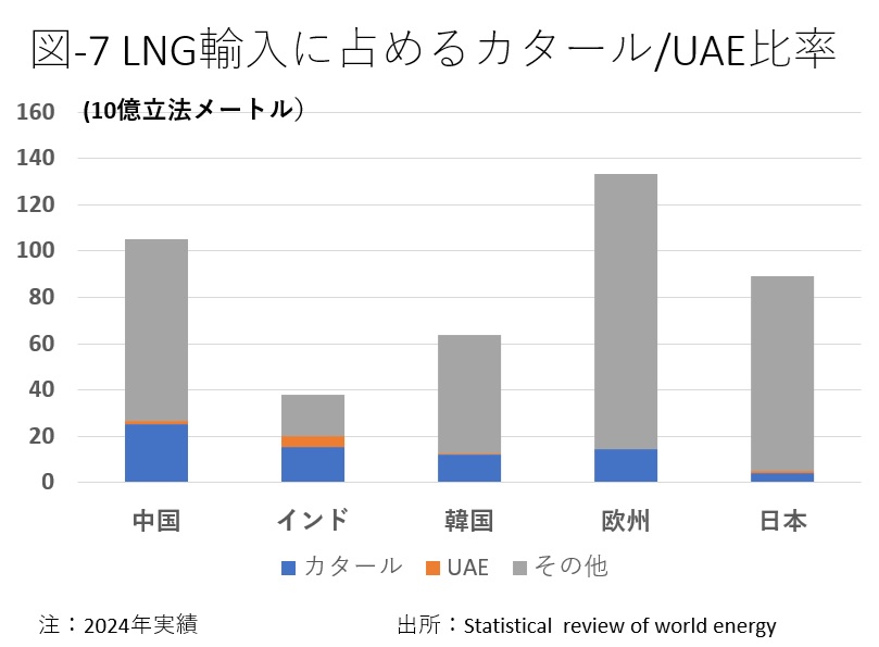 中東のLNGに依存している国はアジアに多く中国、インドと続く(図-7)。日本はLNGを豪州、マレーシア、米国などからも輸入しており、カタールとUAEのシェアは6%に留まっている。