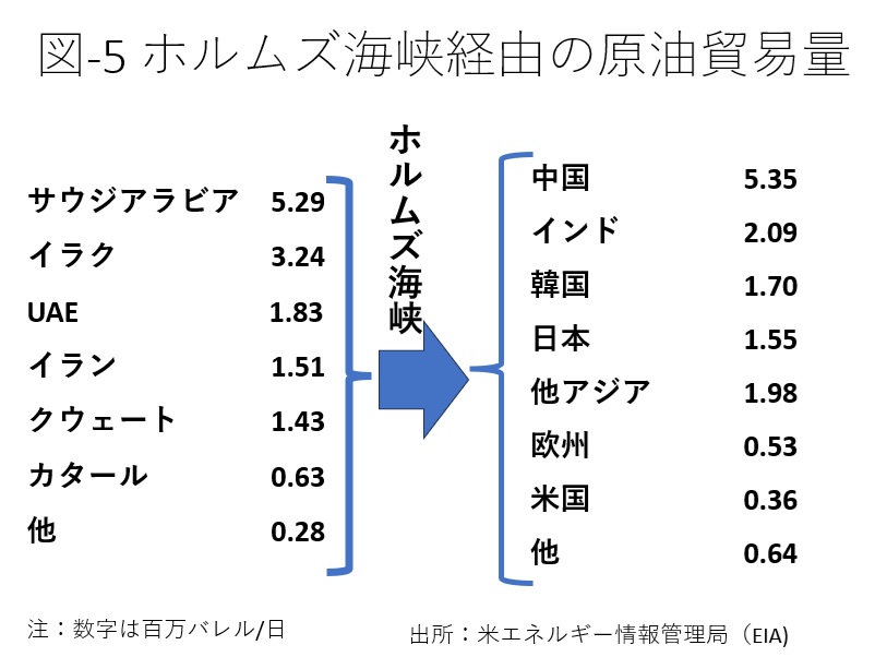 図-5が、25年第1四半期のホルムズ海峡を通過した原油の輸出国と輸入国を示している。中東からの原油購入量が多い国は中国、インド、韓国と続き日本は4番目になる。