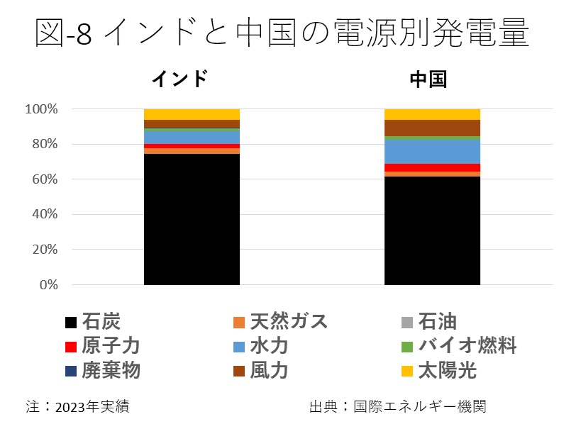 中東のエネルギー依存度が高いアジアの国、中でも自国に石炭資源を持ち石炭火力の供給比率も高い中国とインド(図-8)は、石炭火力の炊き増しでLNGの供給減と価格上昇に対処可能だ。他のアジア諸国もコストが高騰するLNG火力から石炭火力への切り替えの可能性が高く、石炭価格も上昇する。