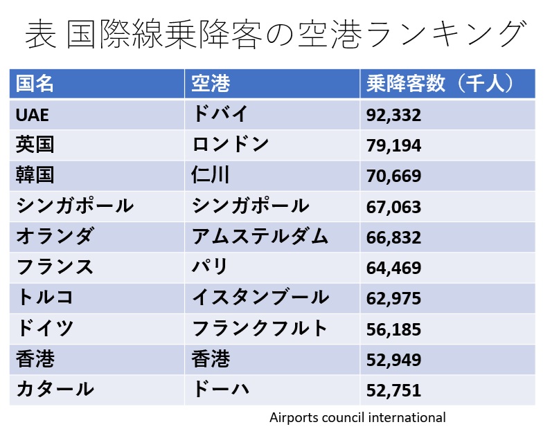 発展したドバイは世界の空路の中心になった。表が世界の空港の国際線旅客の乗降数を示しているが、世界一はドバイだ。10位にはカタール・ドーハがランクインしている。ドバイは国内線旅客を含めても米アトランタに次いで世界2位だ。