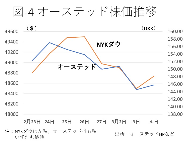 洋上風力事業最大手デンマーク・オーステッドの株価も低迷している。図-4がニューヨークダウ平均との動きを比較している。