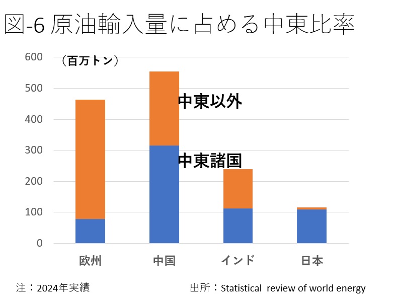 図-6が中国、日本などの輸入量における中東比率を示している。原油輸入に占める中東の比率は日本がずば抜けて高く、ホルムズ危機の影響を強く受ける。