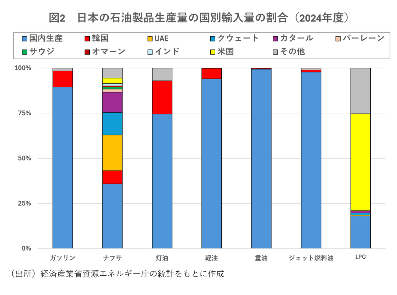 ナフサは石油製品の中でも海外依存度が特に高い。24年度には供給量の64%を輸入で賄っており、輸入先はUAE、カタール、クウェート、バーレーン、サウジアラビアなど湾岸諸国に大きく偏っている。流通量全体に占める中東依存度は47%に達しており、同じ石油製品でありながら対米依存度(53%)の高い液化石油ガス(LPG)と比べても、ナフサ供給は中東への依存構造がより顕著となっている。