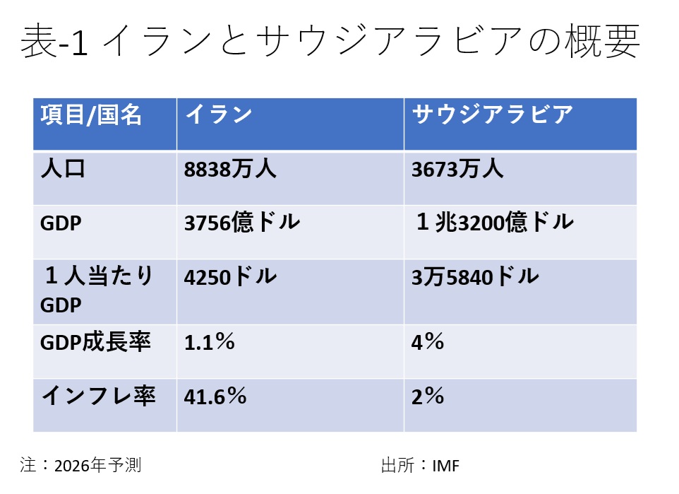 同じく中東の大国サウジアラビアと比較すれば、イラン経済の低迷ははっきり分かる(表-1)。予測の26年の数値は戦争によりさらに悪化する。