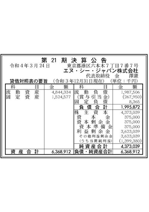 NCジャパン、2021年12月期の決算は最終利益293%増の13億9900万円