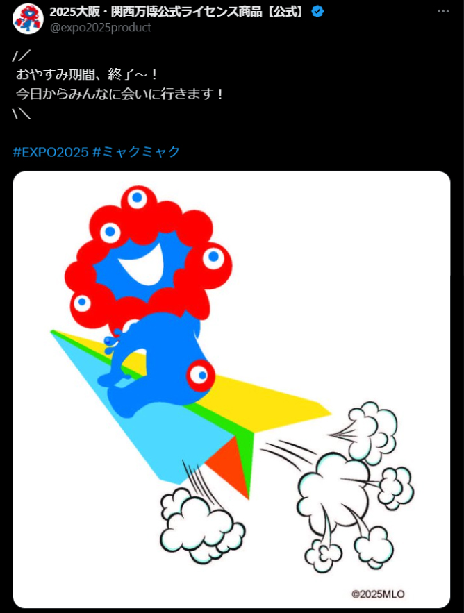 閉幕後もキャラとしてのミャクミャクは人間の世界で活動を続けている。「大阪・関西万博公式ライセンス商品」のXで10月15日、「ミャクミャク、今日からお休みをいただきます」と告知したが、わずか3日後の18日には「おやすみ期間、終了~! 今日からみんなに会いに行きます!」と復帰を宣言。この日は関西を飛び出し、大丸東京店での「大阪・関西万博オフィシャルストア大丸松坂屋百貨店」のイベントに登場した。万博協会関係者によると、各地のイベントから派遣のオファーが相次いでおり、今後も姿をあらわすことになりそうだという。