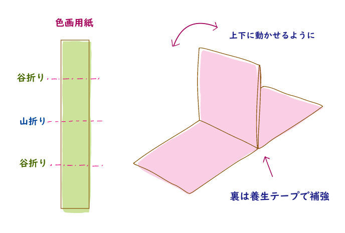 具体的にいいますと、細長い画用紙を四つ折りにし、真ん中でぱたぱたと上下に開いて動かせるようにした札を作成(百枚)。表になるほうに上の句を書いて、真ん中をぱたりと上げると下の句が見えるように作ります。