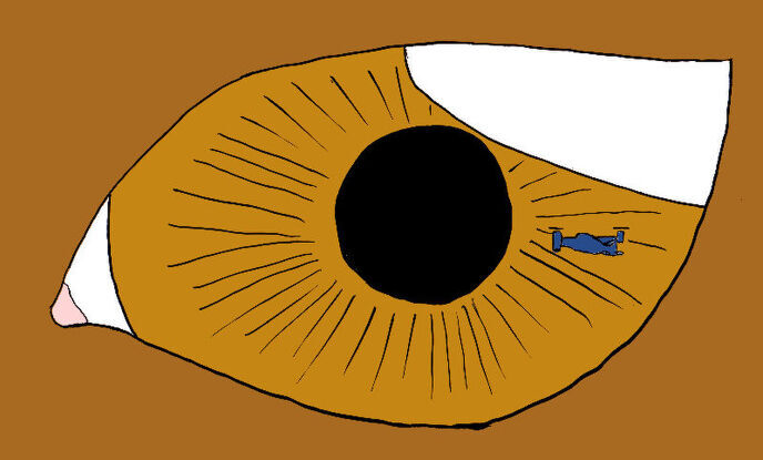 ホバリングする青黒い垂直離着陸機の前、巨大な瞳がこちらに視線を向けている。