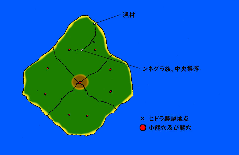 地理的な事を言えば、島の中央、休火山カガネ山に島に住む蜥蜴人達が守護崇拝する龍穴があり、その周囲、島の東西南北に全部で八つ力の吹き溜まりである小龍穴が存在している。