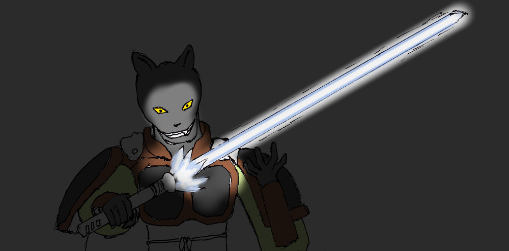 ギャガンが拾い上げた健太郎を興味深そうに眺めていると、筒に付いたボタンが押され、端から長さ一メートル程の青白い光の刃が生成される。