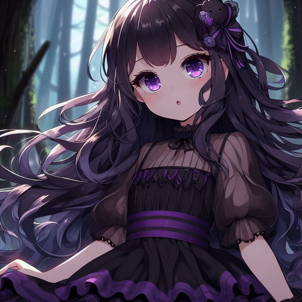 彼女の姿は、幼い少女のものでありながら、何か特別な雰囲気をまとっていた。長い漆黒の髪はゆるやかにウェーブがかかり、風に揺れるたびに闇の光を反射して美しく輝く。