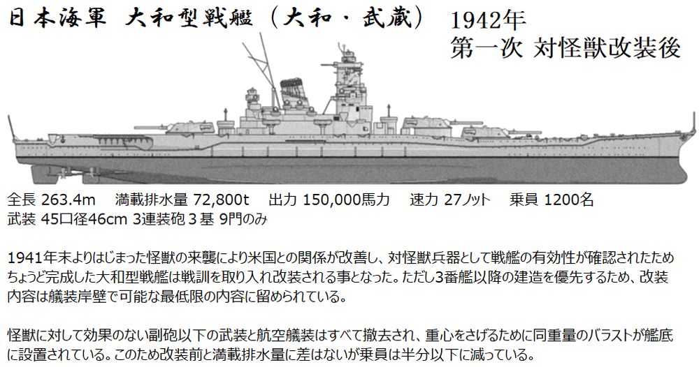 英米と怪獣対策で協力するにあたり、ロンドン条約の失効で元から無かった戦艦建造の制限は、改めて設けない事が合意されていた。