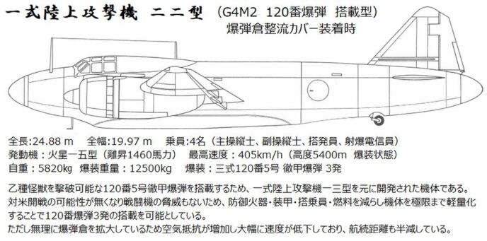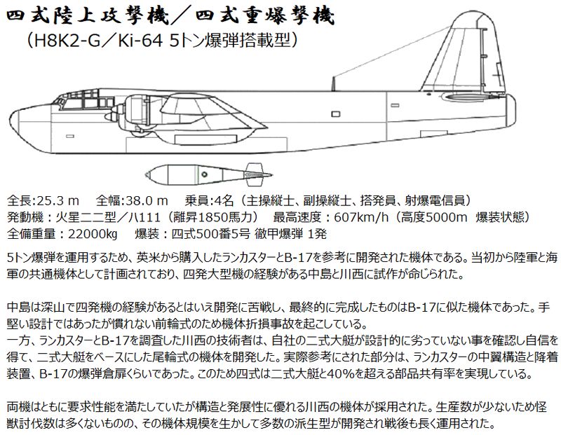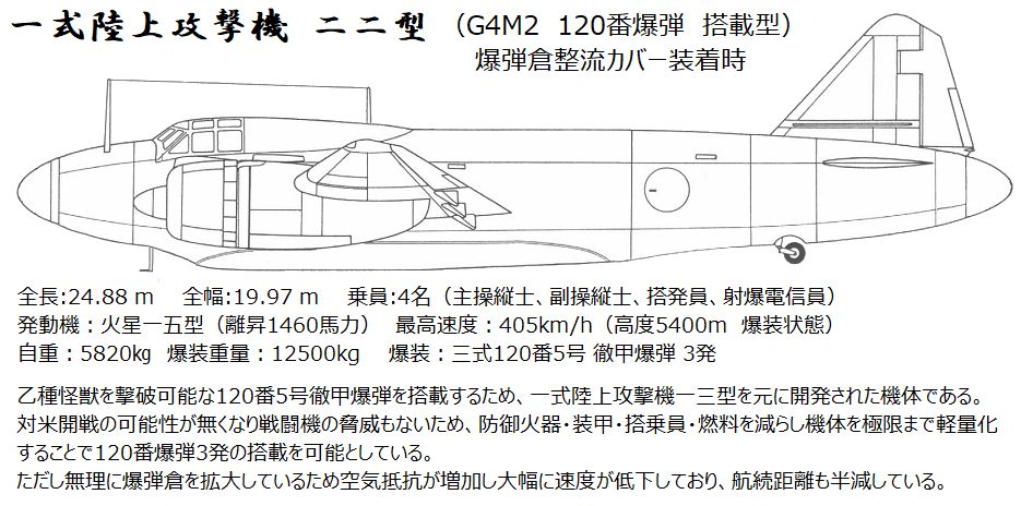 爆弾は昭和十八年中には完成したが日本の機体開発は昭和十九年(1944年)にずれこむ。だがこれにより日米英は航空機でも甲種怪獣を倒す手段を手に入れる事となった。