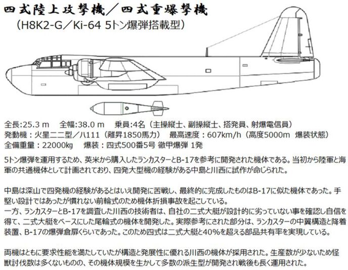 英米は保有する4発爆撃機を改造すれば、なんとか搭載できる目途もあったが、日本にはそれが無かった。困った日本は英米に泣きつき、ランカスター爆撃機とB-17爆撃機の設計と実機を売却してもらえる事になった。これを元に陸海軍共同で大型爆弾を搭載できる四発爆撃機を開発する事となる。