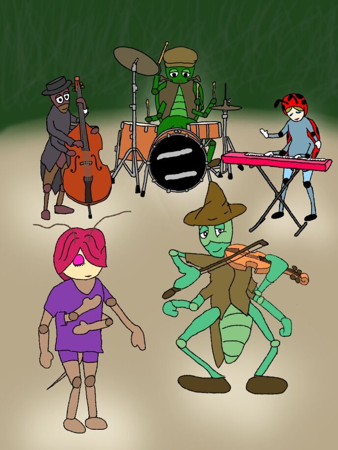 ギリィはいつものように即興でバイオリンを静かに弾き始めます。カナブンがスローテンポでドラムを合わせると、すぐにコオロギもベースでコードを合わせました。テントウムシのキーボードが揃うと、リンは静かにステップを踏み始めます。