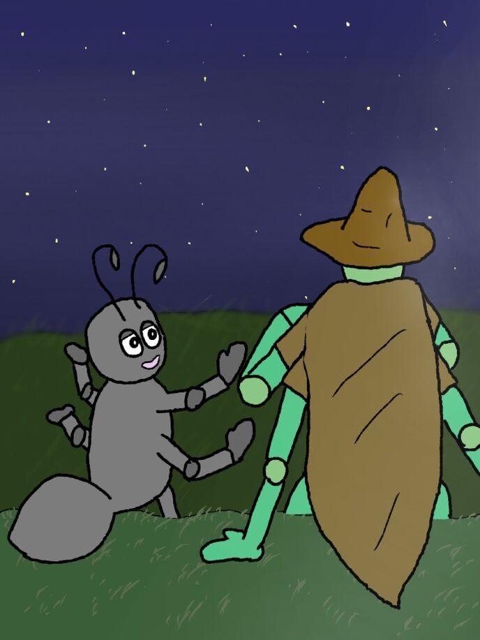 ギリィは広い野原の小高い丘に座り、辺りを見渡していました。月明かりも無く、優しい星の輝きが空一杯に広がり、辺りを静かに照らしています。