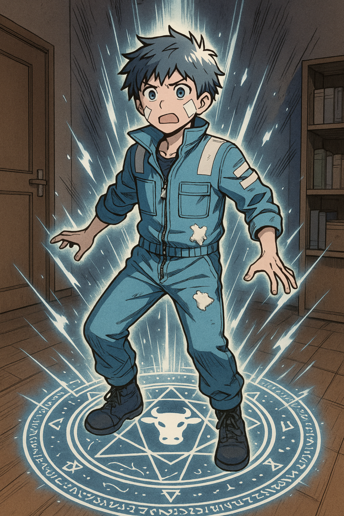 靴を履いたまま、愛着の湧いた長年の根城の中央に立つ。俺の目の前でクータンはスッと立ち上がり短い前脚を天井へ掲げる。なにやら呪文のようにぶつぶつと言っているが俺の耳では聞き取れない。すると急に足元に、牛の模様の魔法陣?そういや、クータンって一応牛だった。