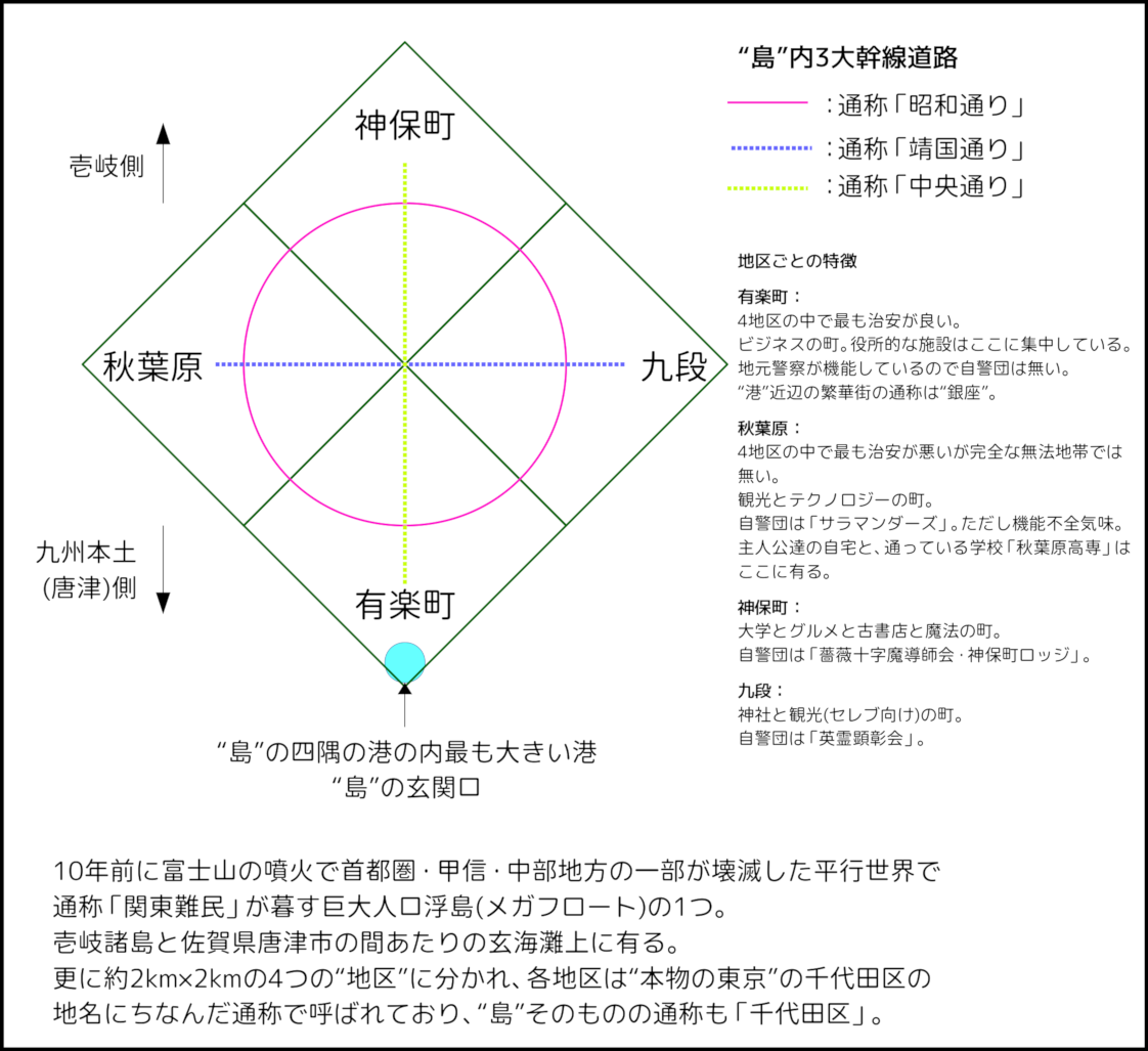 だから、あたし達が「関東難民」と呼ばれ、この巨大人工浮島が「Neo Tokyo」と呼ばれ、そして、自分が住んでいる町が「秋葉原」と云う東京の地名で呼ばれている事に、違和感を感じる。いや……より正確に言えば、嫌な気分になる事が有る。「難民」として見捨てられ、その「難民」の中でも「田舎者」扱い……更に、もう1つの理由で、あたしは「見捨てられた人間」の3乗だ。