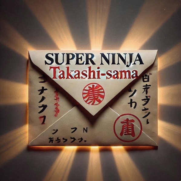 時は現代。ある日、タカシはいつものように学校から帰る途中、目に見えない奇妙な光に包まれた。そして、彼の手の中に一通の封筒が現れる。それは、赤い文字で「スーパー忍者・タカシ様へ」と書かれたものだった。タカシはその手紙を開けると、そこに書かれた内容はこうだった。